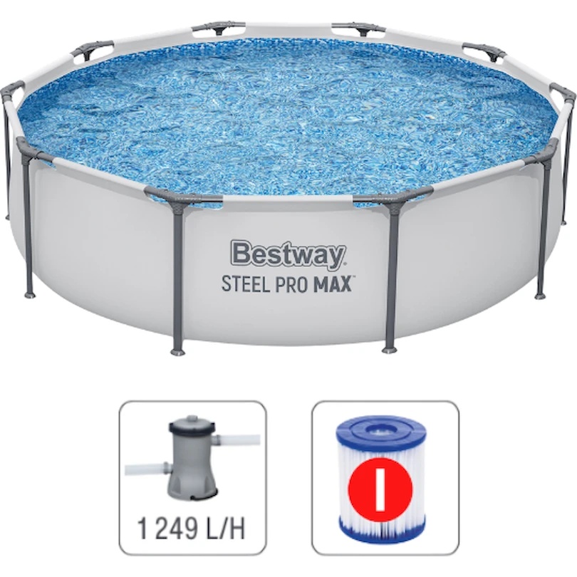 В комплект поставки входят фильтр-насос с производительностью 1249 л/ч для очистки и циркуляции воды, картридж, шланги и хомуты, необходимые для подключения к бассейну.