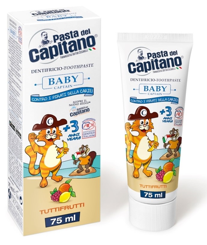 Нежная зубная паста со вкусом Фруктов, которая защищает и укрепляет десны, а так же благодаря своей формуле, обогащенной кальцием, поддерживает здоровье молочных зубов. Одно из преимуществ современной пасты - безопасный состав, в котором не содержится парабенов, триклозана, фармальдегидов и Лаурилсульфат Натрия (SLS).Формула зубной пасты Pasta del Capitano высоко оценена ведущими стоматологами мира, Ассоциацией Стоматологов Италии и миллионами постоянных клиентов.