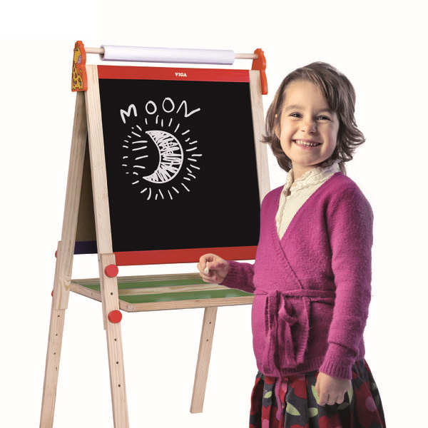 Мольберт двусторонний черный с одной стороны, и белый магнитный - с другой. В комплекте: коробка с цветными мелками, губка для стирания, черный фломастер, 4 магнита, 10 метров бумаги. Высота регулируется.