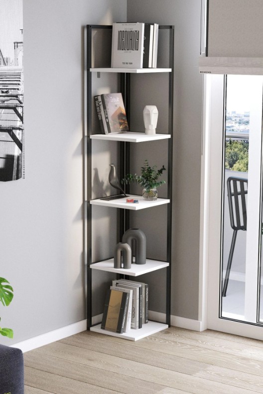 Угловой стеллаж с 5 полками — это современное и практичное решение для эффективной организации пространства в гостиной, офисе или спальне. Угловая конструкция позволяет максимально использовать пространство и удобно задействовать свободные углы.