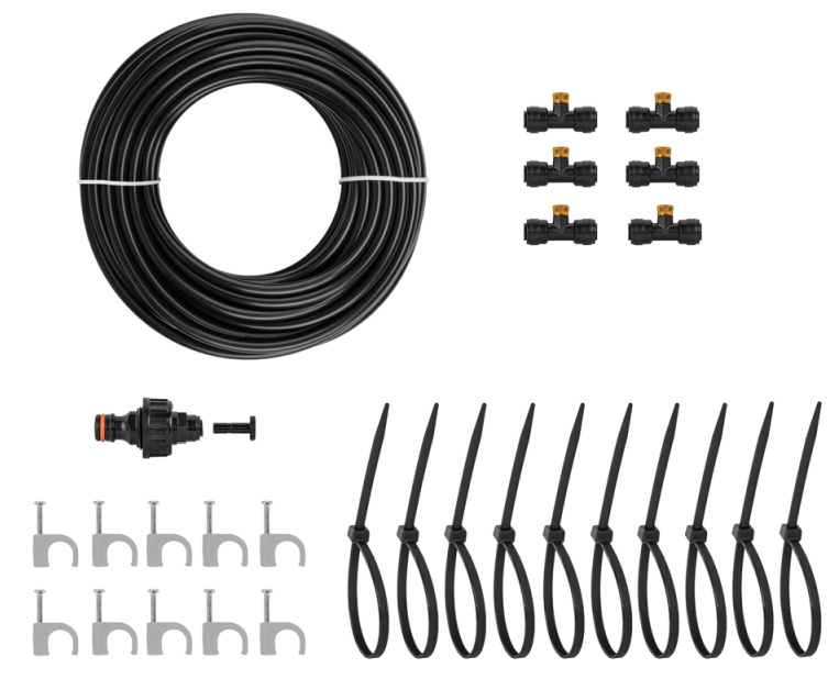 Комплектацияадаптер для быстрого подключения с фильтром, 6 латунных форсунок, 10x держатель шланга, 10 кабельных лент, заглушка