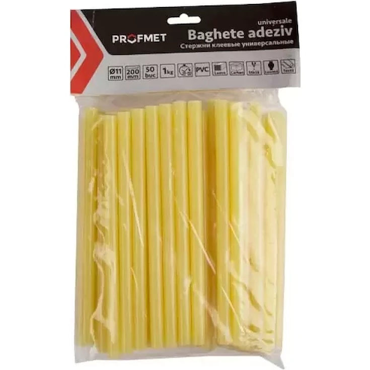Жёлтые клеевые стержни PROFMET идеально подходят для быстрой и надёжной склейки различных материалов. Они изготовлены из нетоксичной смолы EVA, не имеют запаха и не содержат растворителей, что делает их безопасными в использовании. Предназначены для работы с термоклеевыми пистолетами, которые плавят стержень, подавая горячий клей, застывающий в течение нескольких секунд.