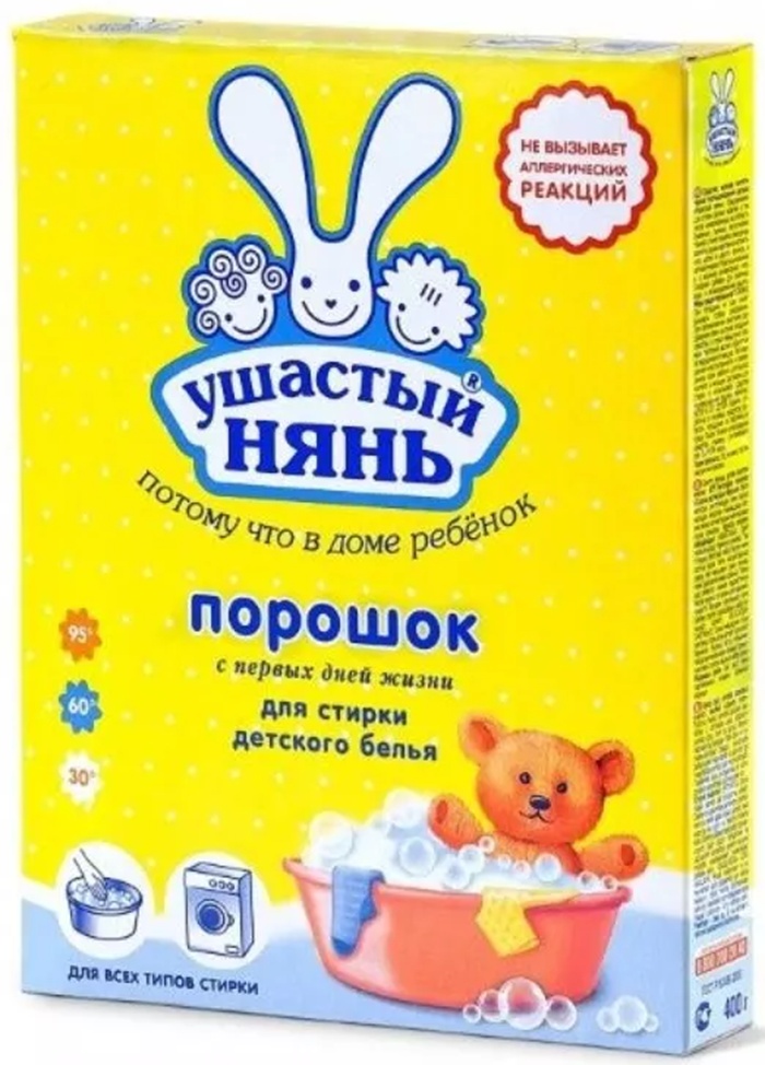 СМС «Ушастый нянь» начинает действовать уже в процессе замачивания и удаляет загрязнения даже в воде низкой температуры. Эффективно справляется с загрязнениями пигментно-масляного характера: сажа, оливковое масло, минеральное масло, белкового: кровь, молоко и углеводного: какао, шоколадный крем, каша, трава, а также с пятнами от чая и красного вина на хлопчатобумажной ткани и ткани из смешанных волокон. Использование мягких отбеливателей и низкое значение pH не повреждает структуру волокон тканей в процессе стирки, что позволяет сохранить первоначальный вид одежды в процессе многократных стирок.