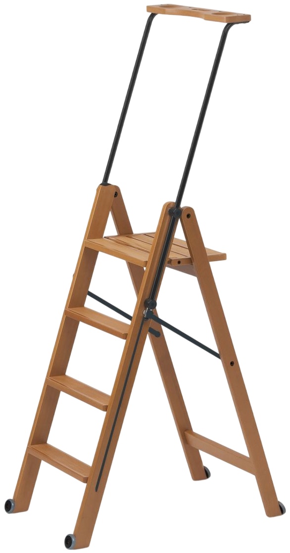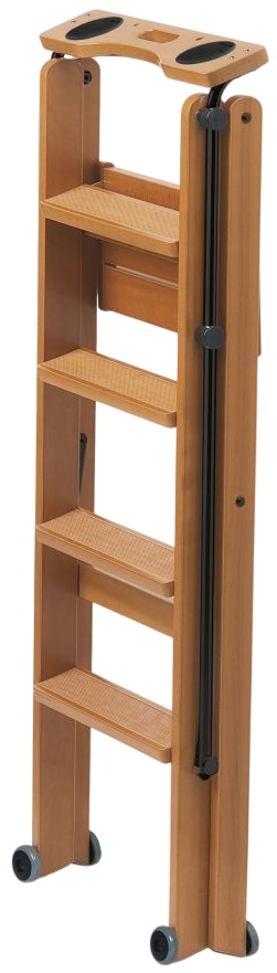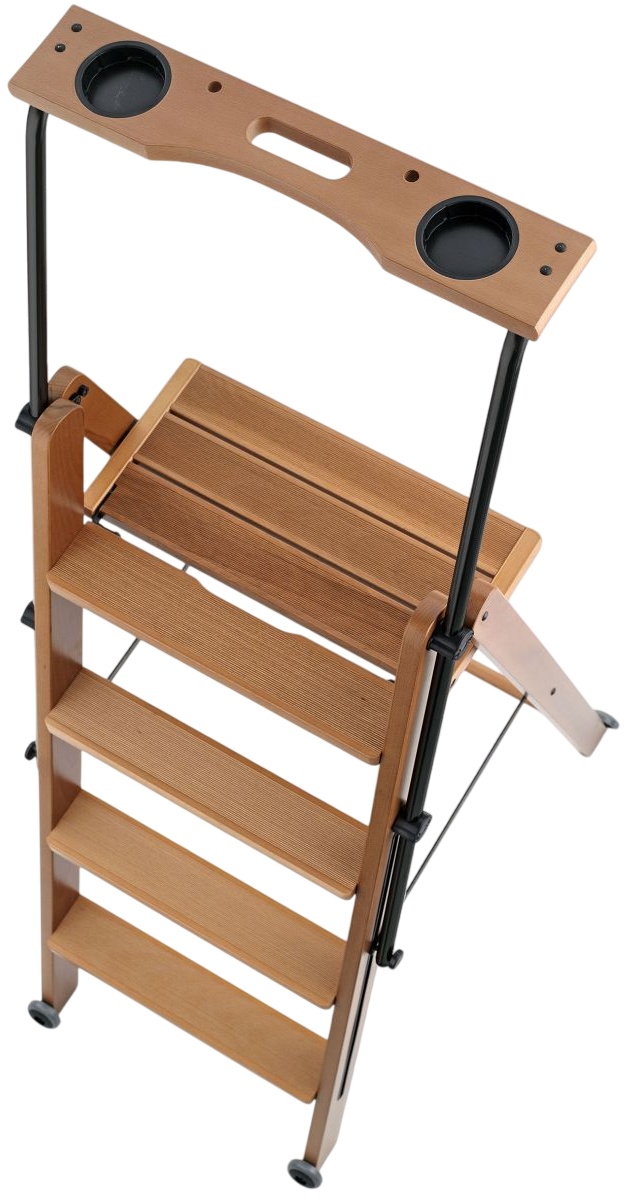 Лестница-стул Arredamenti Tuscania 4 Cherry Tree с 4 противоскользящими ступенями полностью выполнена из цельного бука, окрашенного в цвет вишни, и оснащена системой безопасности, предотвращающей случайное закрытие лестницы в открытом положении. Конструкция прочная и надежная, максимальная грузоподъёмность составляет 120 кг. Верхняя платформа находится на высоте 89 см и оснащена опорной поверхностью для инструментов. Лестница легко закрывается с помощью бокового скользящего механизма и в сложенном виде занимает всего 12 см, самостоятельно устойчиво стоя на поверхности. Для удобного перемещения предусмотрены 4 резиновые колеса, которые функционируют только в закрытом положении. Ступени из бука имеют противоскользящую обработку, а продукт протестирован TÜV Rheinland Italy. Лестница поставляется полностью собранной, колеса требуют крепления. Оригинальное изделие Made in Italy, эксклюзивно от ARREDAMENTI ITALIA GROUP S.R.L., сочетает прочность, удобство и безопасный дизайн.