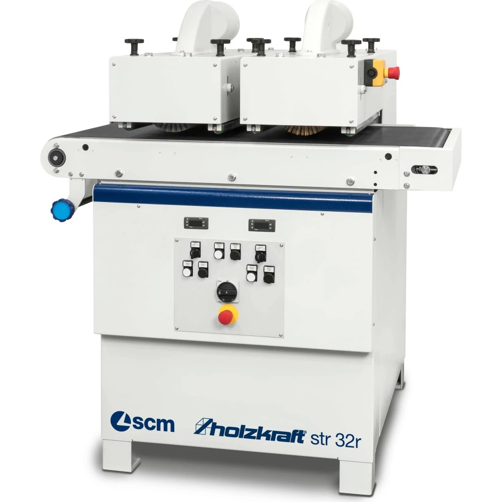 Holzkraft STR 32L — это профессиональный щеточный шлифовально-структурирующий станок, предназначенный для обработки древесины, МДФ и шпона. Буква «L» в названии указывает на наличие инвертора для плавной регулировки скорости вращения щеток, что критично для работы с чувствительными материалами.