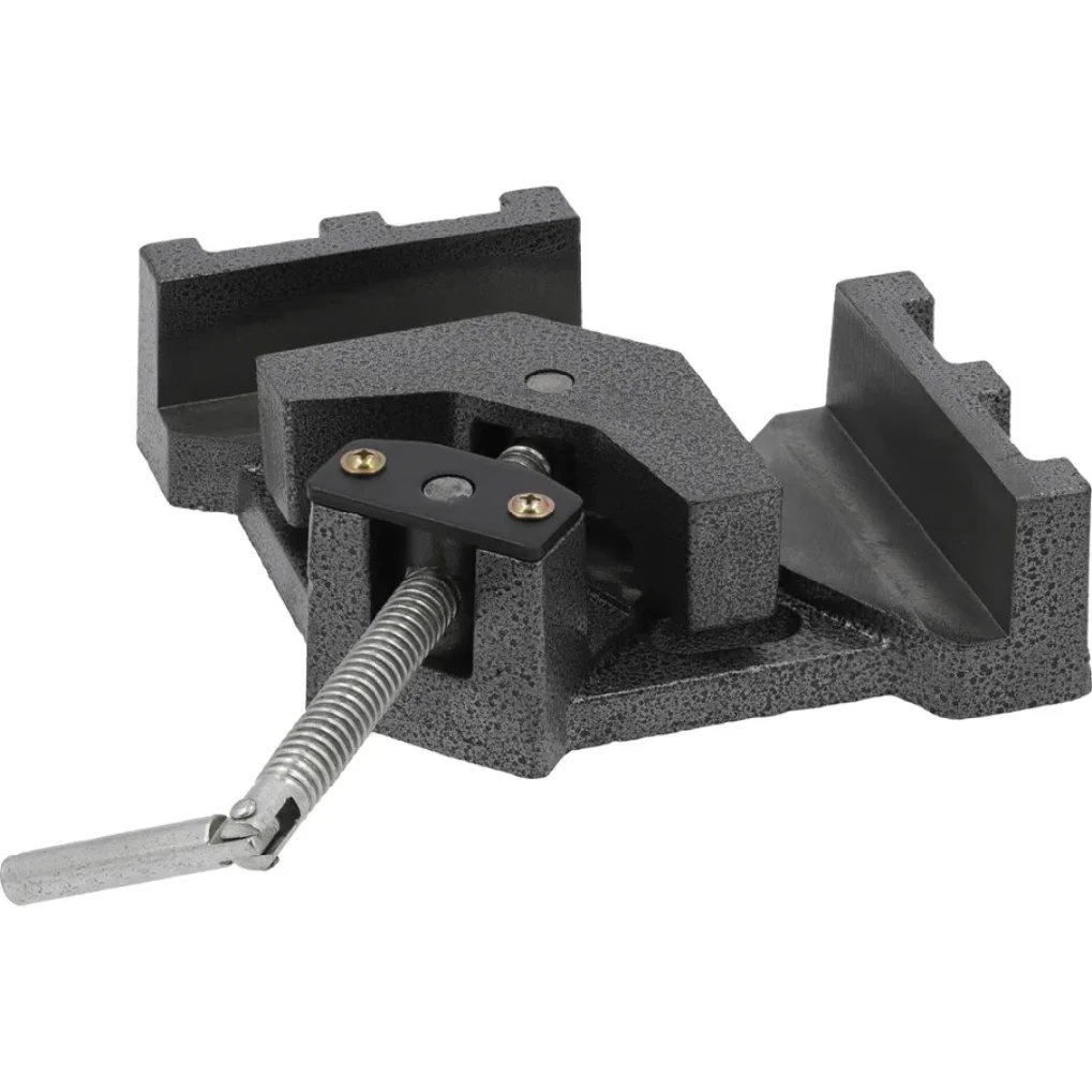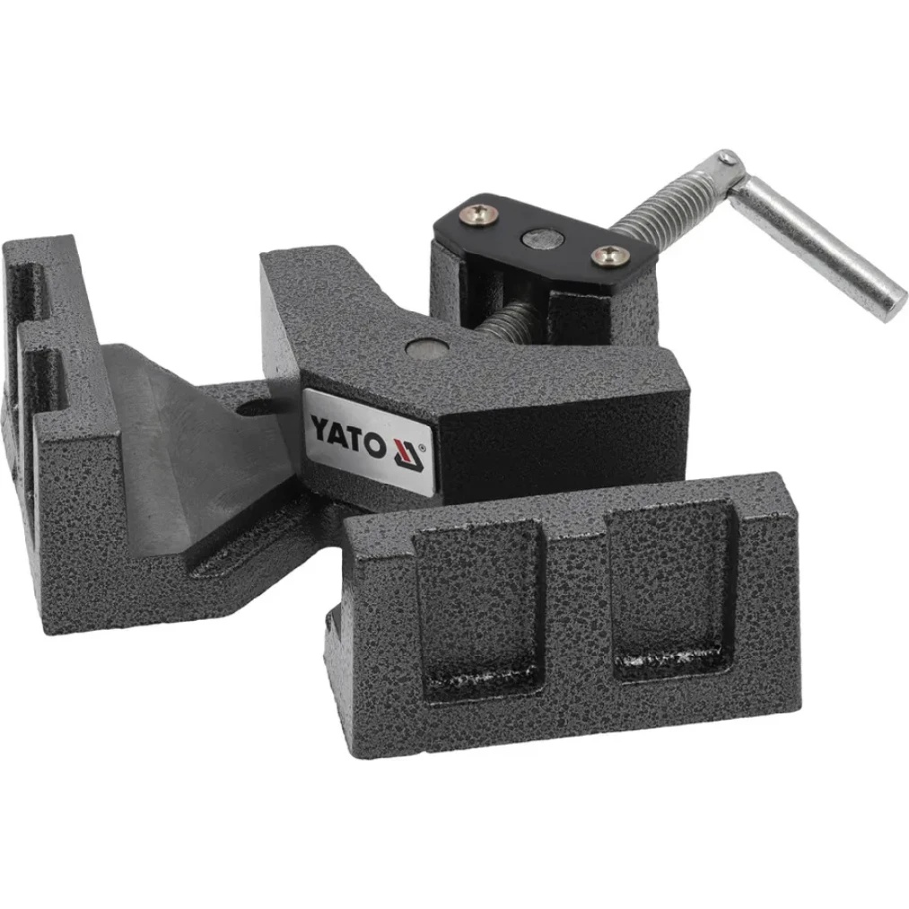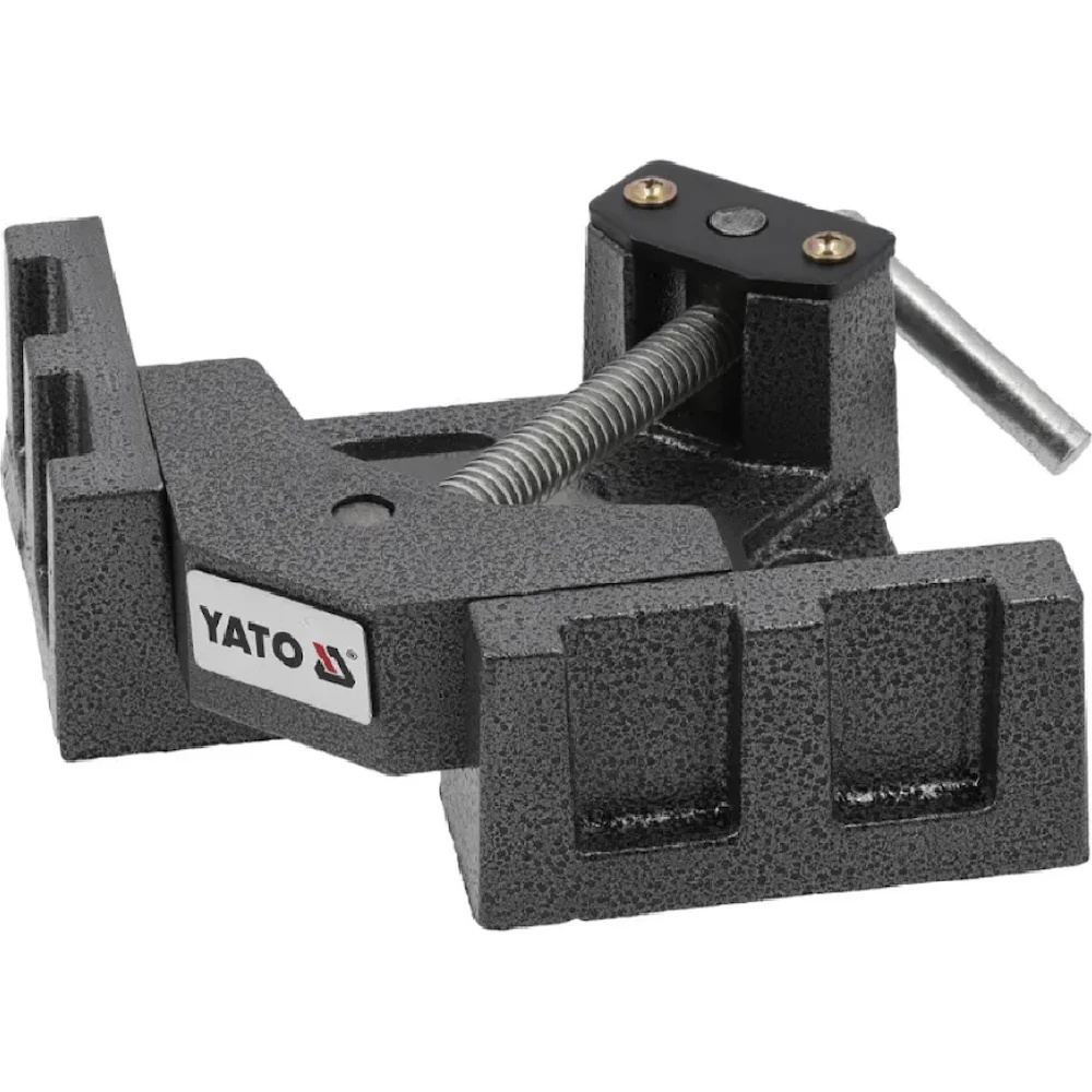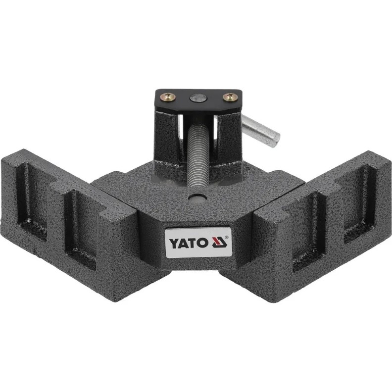 Угловые тиски YATO YT-65137 для зажима материалов под углом 90°. Прижимной винт, установленный в движущемся валу, позволяет асимметрично располагать прижимную губку, удерживая таким образом элементы разной толщины. Используется, среди прочего, в сварочных, столярных и механических мастерских для изготовления соединений с полос или досок.