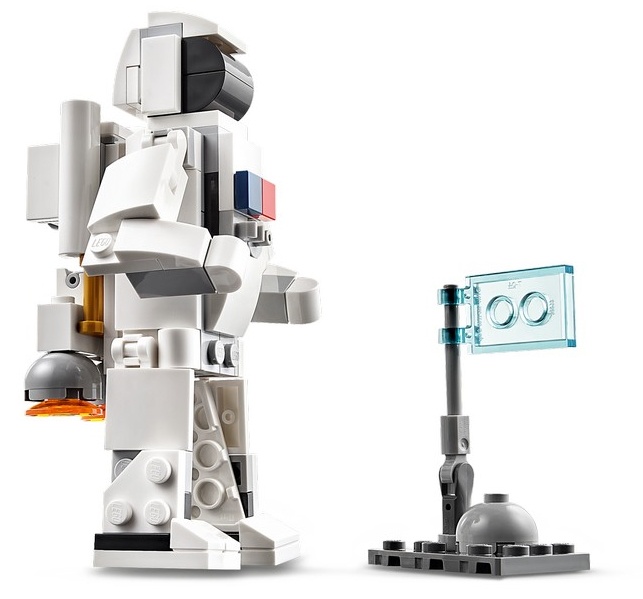 В этом наборе LEGO Creator 3в1 для любителей космоса предусмотрены 3 различных способа сборки и игры. Они могут собрать игрушечный космический челнок, а затем перестроить его в фигурку астронавта с реактивным ранцем и флагом для установки или впечатляющую модель космического корабля.