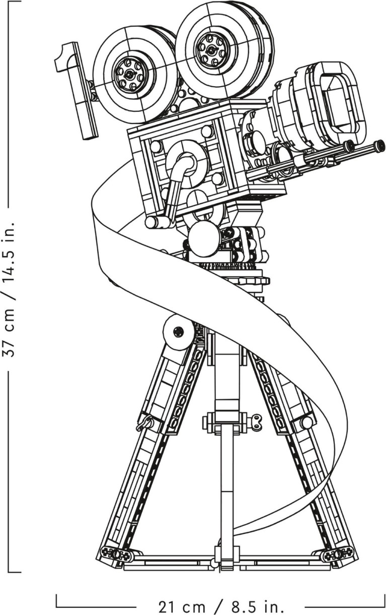 В этот детализированный коллекционный набор входит кинокамера в винтажном стиле с откидной задней панелью и кинопленкой, демонстрирующей кадры из 20 исторических фильмов Disney. А также режиссерская хлопушка с местом для 3 минифигурок, 2 фигурки животных и многоплановая камера с 3 печатными экранами, демонстрирующими, как создавался короткометражный фильм Диснея "Старая мельница".