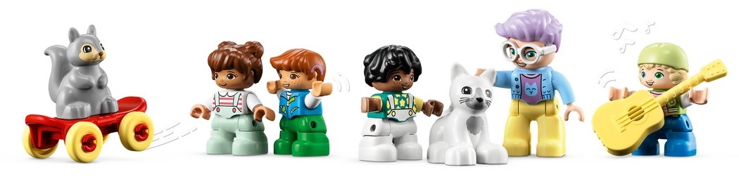 Сначала дети строят игровую площадку с 3 уровнями, сверхдлинной горкой и шатким мостиком для перехода. Если собираются дождевые тучи, модель перестраивается в уютный домик на дереве. Третья модель состоит из 2 домиков на дереве, каждый с горкой, и сада, где дети помогают собирать фрукты и перетаскивать их в домик на дереве с помощью симпатичного шкива.