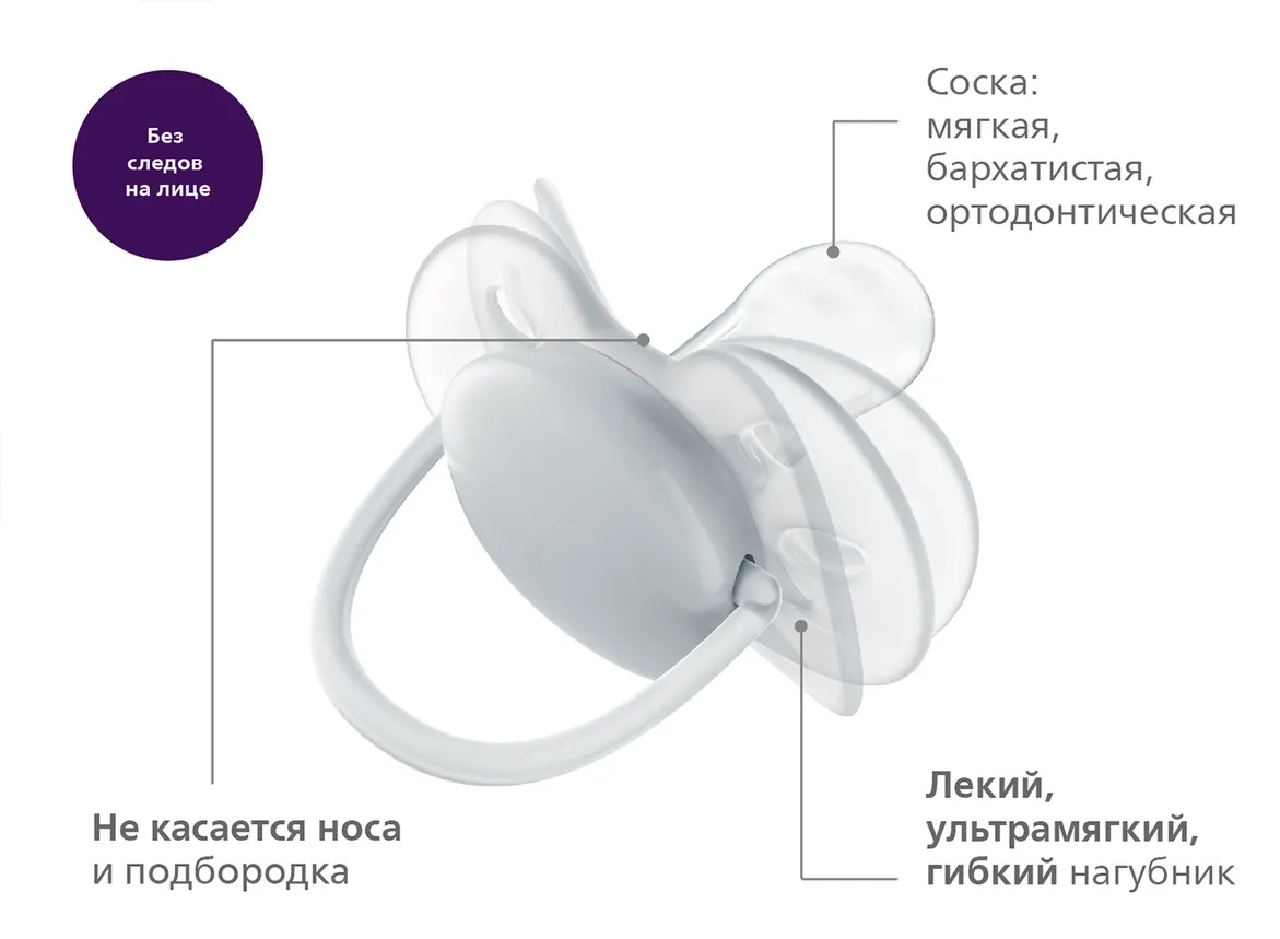 Коже малыша требуется особый уход. Благодаря технологии нагубника пустышка повторяет естественные контуры лица. Пустышка оставляет меньше следов и раздражения на коже малыша. Закругленный нагубник снижает давление на щеки малыша для минимального воздействия на кожу.