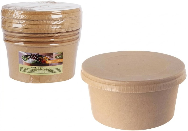 Практичный набор бумажных салатниц с крышками Nature 1L (33880) 5pcs, идеально подходит для пикников, доставки еды или еды на свежем воздухе. Каждый салатник имеет ёмкость 1 литр, а в комплекте 5 штук. Изделия изготовлены из крафт‑бумаги, устойчивы к воде и жиру, безопасны для контакта с продуктами и не выделяют вредных веществ.