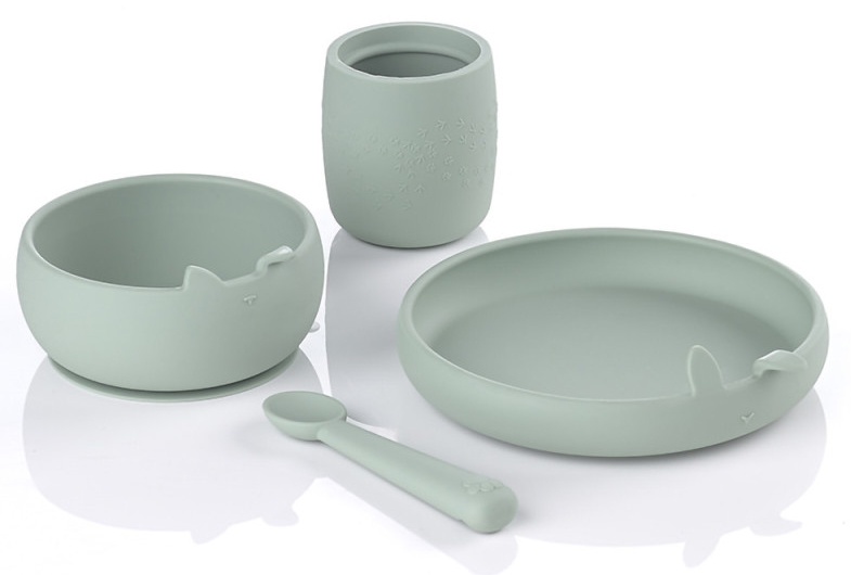 В комплект входят тарелка, миска, ложка и чашка с изображением животных. 100% силикон, не содержит BPA и вредных веществ.