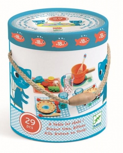 Игровой набор «Котята, к столу!» обязательно понравится ребенку. В комплект входит 4 салфетки, по 2 вилки, ложки, ножа, стакана и тарелки, ковш с лопаткой, мерный стакан и множество ингредиентов, из которых можно приготовить замечательный завтрак (рыба, сыр, фрукты и т.п).