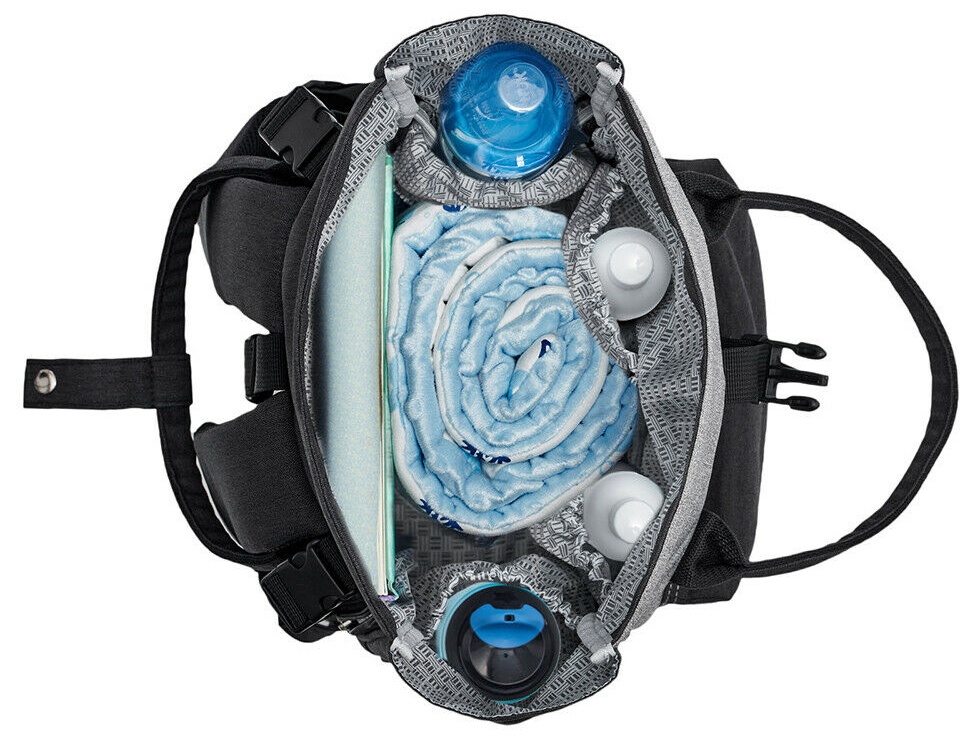 9 практичных карманов: просторное основное отделение, водонепроницаемый карман для мокрых подгузников/одежды, боковой карман для носовых платков, 3 кармана для бутылочек, термокарман, передний карман для мелких предметов и карман для документов на задней стороне спортивной сумки внутри.