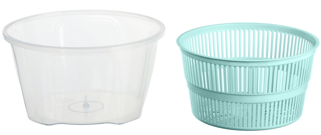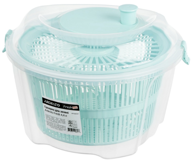 Ручная пластиковая сушка для салата и зелени. Работает по принципу центрифуги и состоит из нескольких элементов: чаши, контейнера для зелени, а также крышки с рычагом. С помощью сушки можно быстро и без лишних усилий высушить листья салата и зелень, не дожидаясь пока стечет вода.