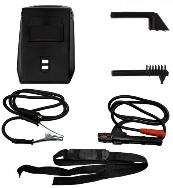 КомплектацияCварочный инвертор, Зажим массы с кабелем, Рукав с держателем электродов, Сварочная маска, Молоток / щетка, Ремень