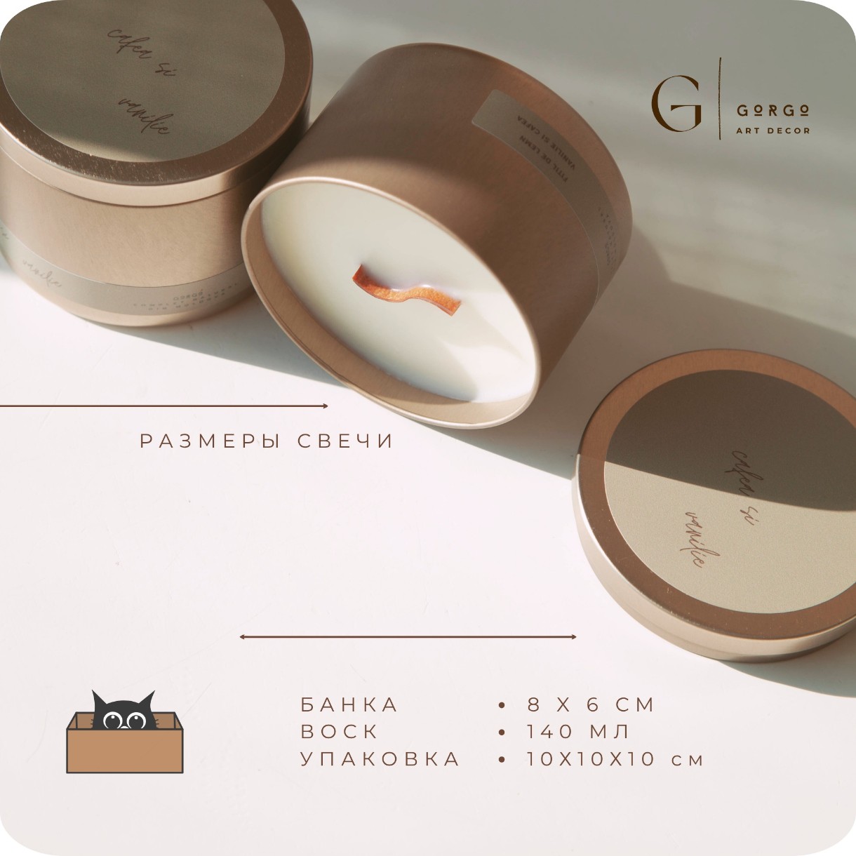 Состав: натуральный соевый воск (140 мл), двойной деревянный фитиль в форме волны, металлическая тара с крышкой цвета розового золота, отдушка.