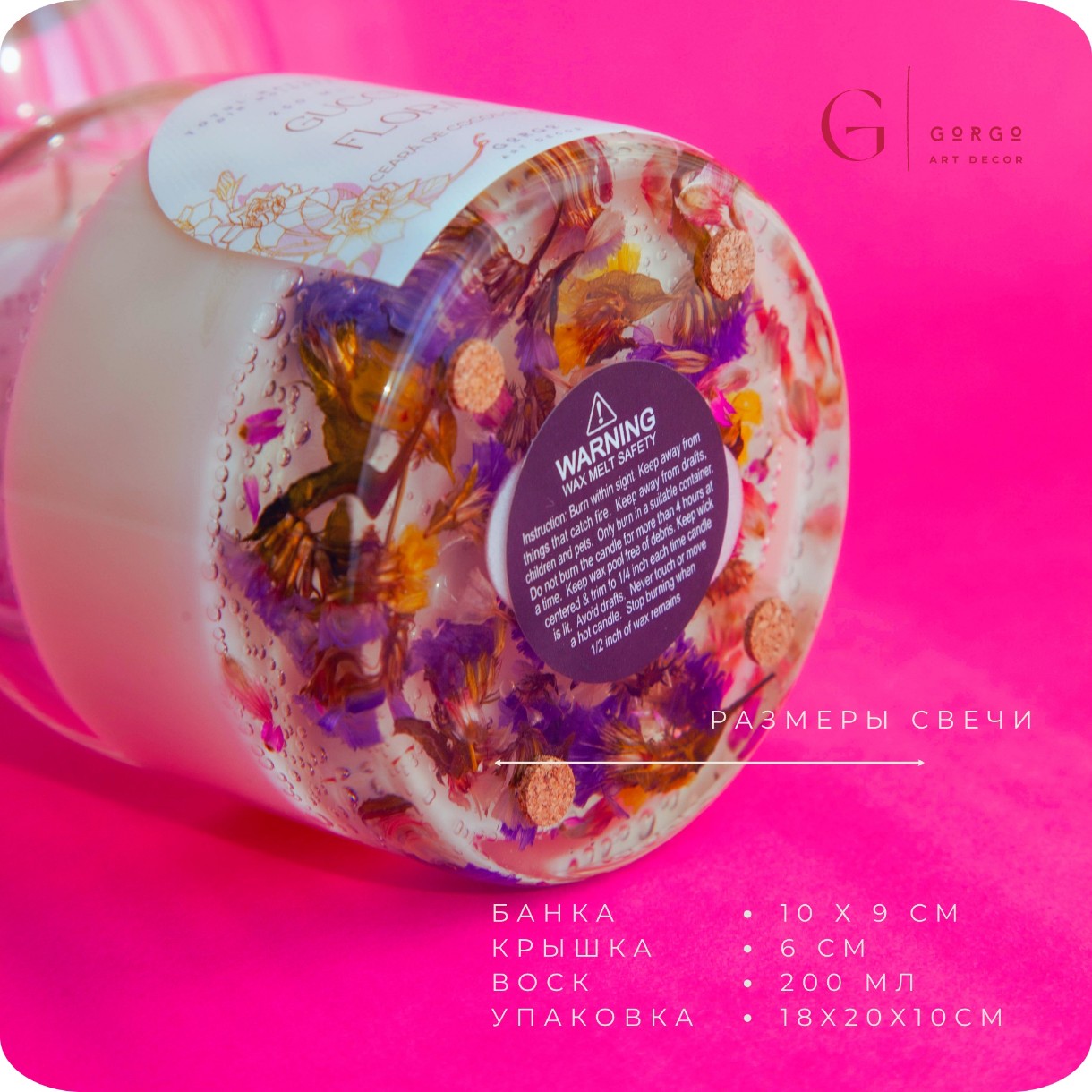 Эта свеча сочетает природную эстетику и премиальный стиль, а мерцающий слой геля с сухоцветами превращает её в выразительный декоративный элемент.