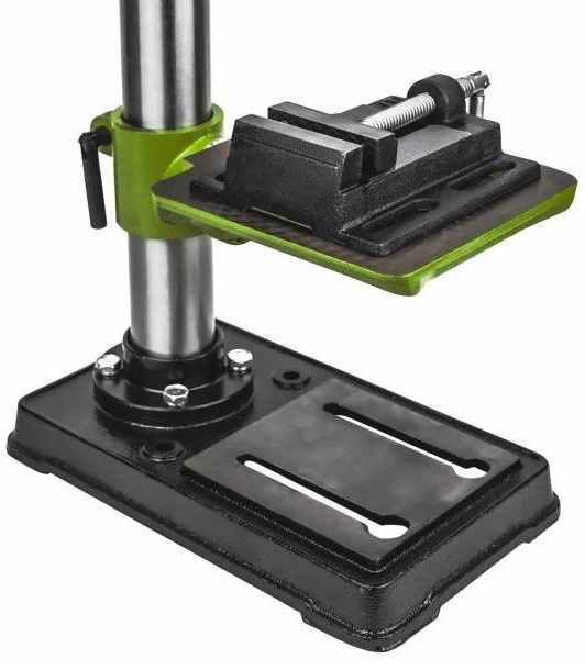 Для создания хорошей устойчивости и уменьшения вибраций, станок может фиксироваться к верстаку крепежами, при помощи отверстий на станине. Рабочий стол свободно регулируется по высоте, поворачивается вокруг стойки на 360 и может наклонятся под углом(до 45). Зажимные тиски устанавливаются на рабочем столе и необходимы для надежной фиксации заготовки во время работы.