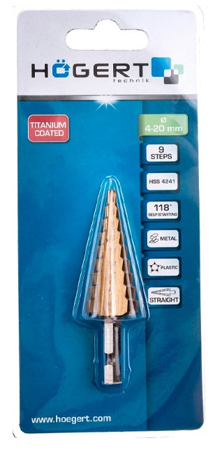 Ступенчатое сверло Hoegert HT6D322 - предназначено для сверления различных типов стали, цветных металлов, меди, латуни и алюминия, нержавеющей стали, пластика и дерева. Позволяет сверлить точные отверстия. Может применяться в кузовных мастерских, автомастерских и т.д. Для профессионального использования.