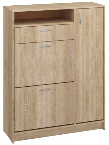 Вместительная тумба для обуви Т-5 оснащена выдвижным ящиком для различных мелочей, а также, двумя отсеками для обуви с откидывающимся механизмом и пеналом с полками за дверцей, которые позволят разместить высокую обувь. Удобная столешница может быть использована как дополнительная полка для сувениров и фото. Модель отличается лаконичным дизайном и универсальной цветовой гаммой, что позволяет предмету вписаться в любой интерьер.