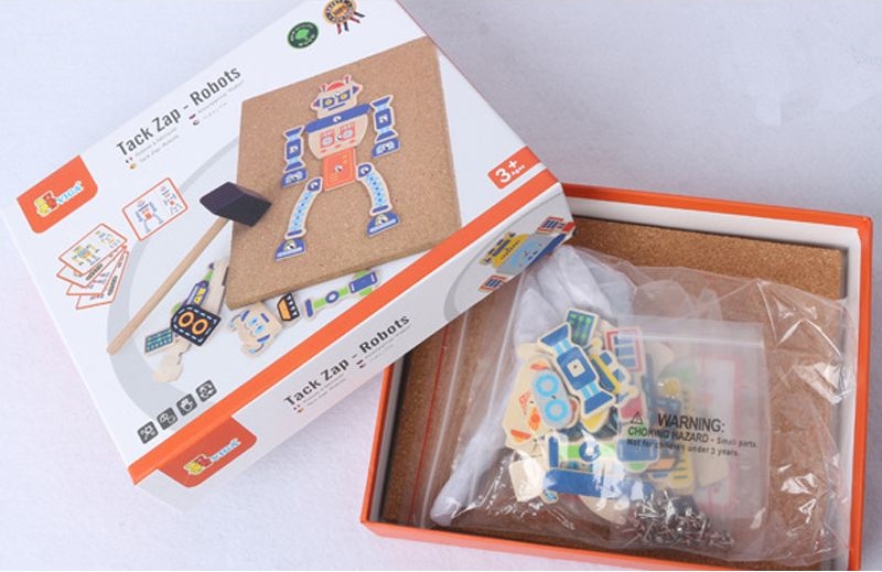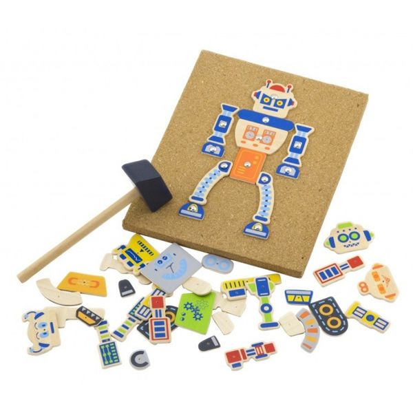 Набор для творчества "Робот" - это игра с молоточком и разноцветными фигурами. Набор "Робот" позволит ребенку создавать множество разных Роботов. Из разноцветных деталей разной формы малыш сможет сложить любого Робота (благодаря подсказкам-примерам с карточек) и закрепить его на пробковой основе при помощи молоточка и маленьких гвоздиков. Игра развивает мелкую моторику ручек и воображение.