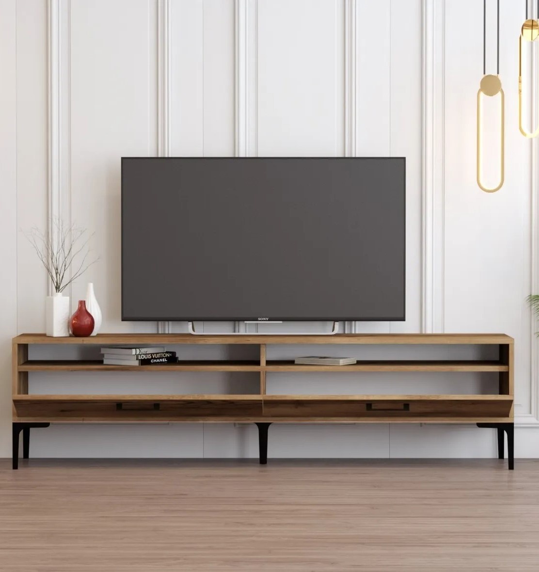 С размерами 180 см в ширину, 35 см в высоту и 47 см в глубину, подставка предоставляет достаточно места для телевизора, медиа-устройств и других аксессуаров. Дизайн включает просторные полки и отделения, позволяя удобно организовать вещи и поддерживать порядок в гостиной.
