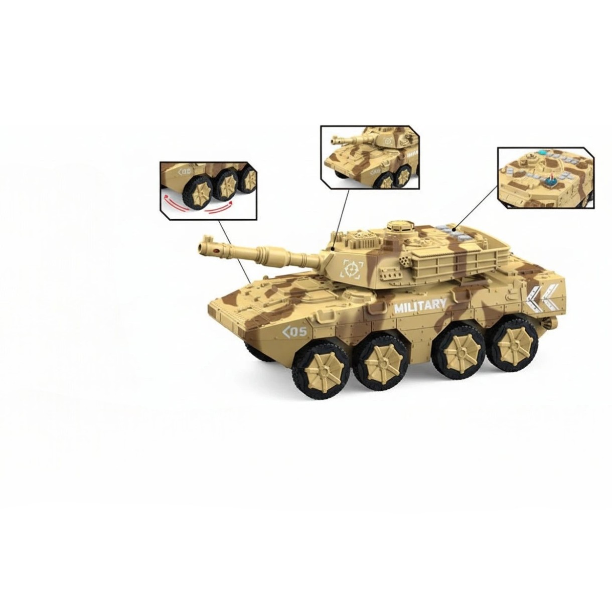 Инерционный механизм позволяет машине двигаться от лёгкого толчка без использования батареек для движения. Подвижная башня и поворотная пушка делают игру более динамичной и реалистичной.