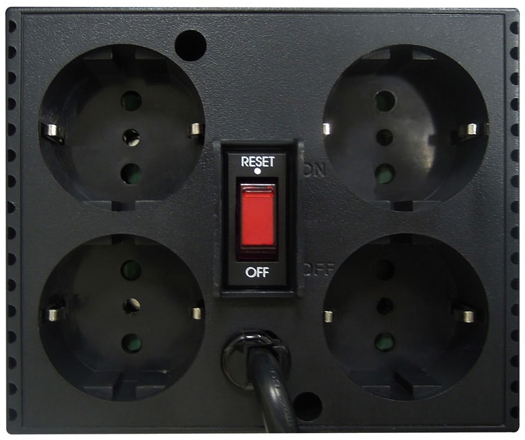 Для защиты от перегрузки и короткого замыкания на выходе предусмотрен автоматический выключатель. После устранения проблемы выключатель легко возвращается в исходное состояние одним нажатием. Трехступенчатая индикация отображает рабочее состояние стабилизатора — нормальное, понижение или повышение напряжения электросети.