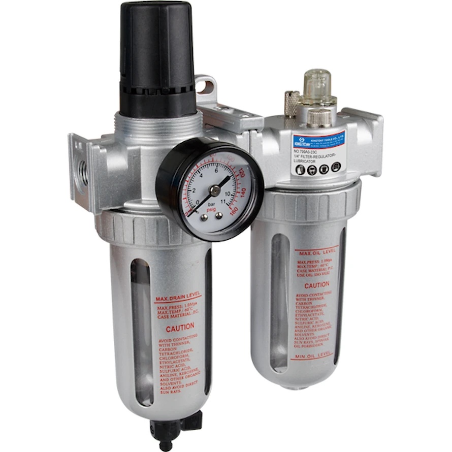 Фильтр-влагоотделитель с редуктором и лубрикатором KING TONY 799A0-23C служит для установки в пневматическую линию для подготовки сжатого воздуха для оборудования. Используется на СТО, шиномонтажах, в гаражах и т.д.