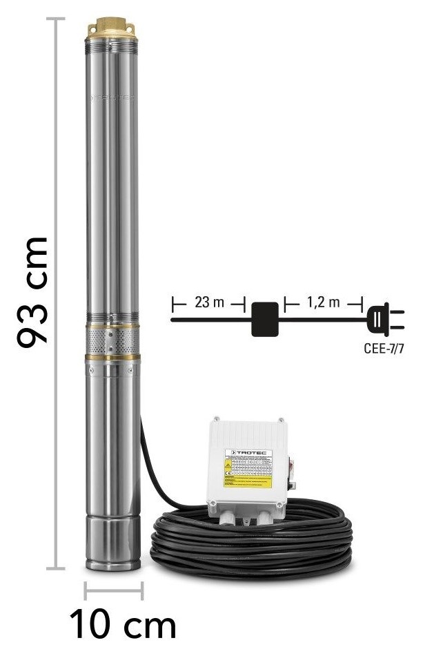 Глубинные насосы Trotec — это специально построенные и высокоэффективные погружные насосы, которые благодаря своей конструктивной форме и качественной технике могут применяться в очень узких отверстиях диаметром 11 сантиметров. Для безаварийного отбора воды с больших глубин насосы оснащены 23-метровым питающим кабелем и подвесными отверстиями, так что насосы могут быть погружены в колодцы, цистерны, водостоки или другие углубления. Как и большинство погружных насосов и глубинных насосов, они могут использоваться мобильно в разных местах или устанавливаться в фиксированных местах.