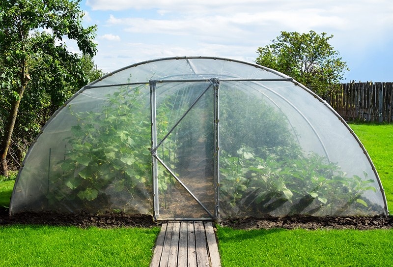 Фольга фиксируется с помощью специальных металлических и пластиковых зажимов, не требуется сверление, а натяжка выполняется быстро и легко. Расстояние между арками составляет 2 м, они соединены с 3 рядами продольных труб.