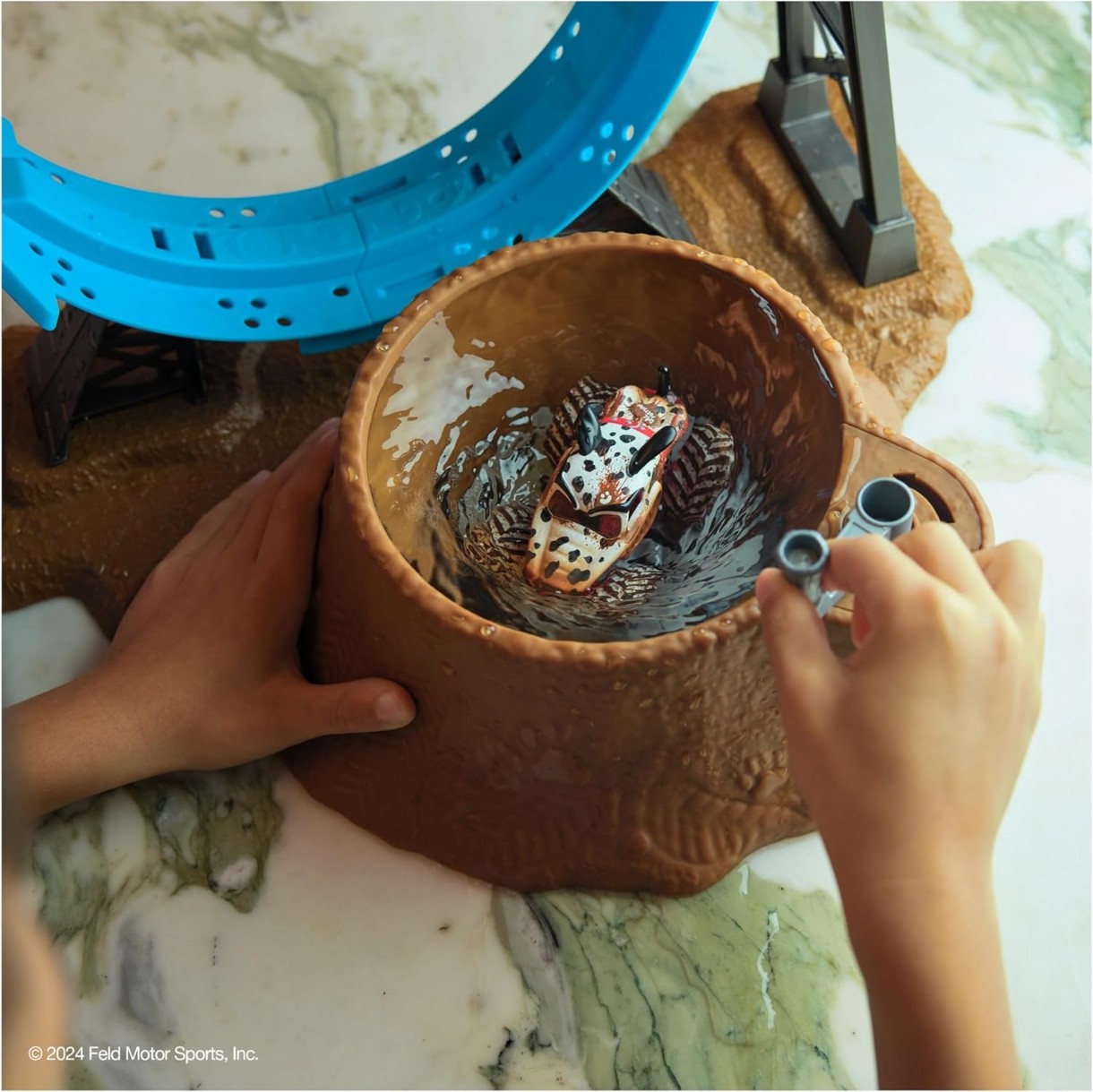 В комплект входит пусковая рампа, мини-бассейн и уникальный монстр-трак Monster Mutt Dalmatian в масштабе 1:64. Запустите грузовик по рампе прямо в ванночку с тёплой водой и наблюдайте волшебное превращение — грязное покрытие смывается, открывая чистый и яркий дизайн. А если окунуть его в холодную воду — «грязь» возвращается!