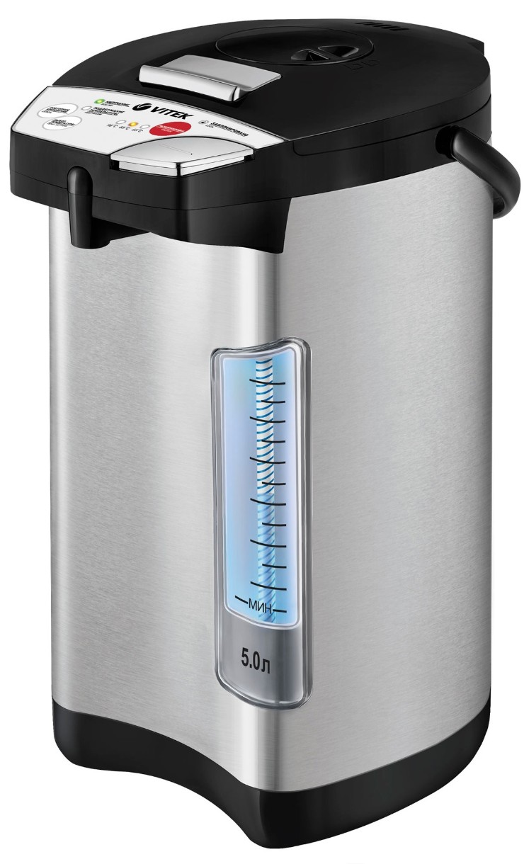 Термопот VITEK VT-7115 позволит вам не только быстро нагреть воду объемом 5 л до температуры 65°С/85°С/98°С, но и сохранить ее в горячем виде, благодаря функции поддержания температуры. В приборе предусмотрено три способа подачи воды: чтобы налить ее в емкость, можно воспользоваться специальным насосом (механической помпой), электрической помпой или просто нажать чашкой на клапан. Хотите еще раз нагреть воду? Нет ничего проще, в термопоте имеется функция повторного кипячения. Следить за уровнем воды позволяет удобная широкая шкала, расположенная на корпусе прибора. Корпус его изготовлен из высококачественной нержавеющей стали, что гарантирует устройству длительный срок эксплуатации. Для максимально безопасного использования в устройстве предусмотрена функция блокировки, поэтому можно быть уверенным, что вода не польется случайно. Максимальная мощность прибора — 800 Вт. Купите термопот VITEK VT-7115, который идеально справляется со своими обязанностями!