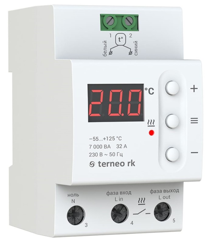 Terneo sn 32A устанавливается внутри помещения. Монтируется регулятор на DIN-рейку шириной 35 мм. Датчик от терморегулятора выводится на улицу и устанавливается на стене или под кромкой кровли так, чтоб на него не светило солнце и не попадал дождь и снег.