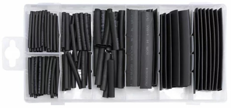 Набор трубoк с термоусадкой. Содержимое упаковки 127 штук трубок разных диаметров и длины. Цвет черный. Все помещается в удобной упаковке типа "органайзер".