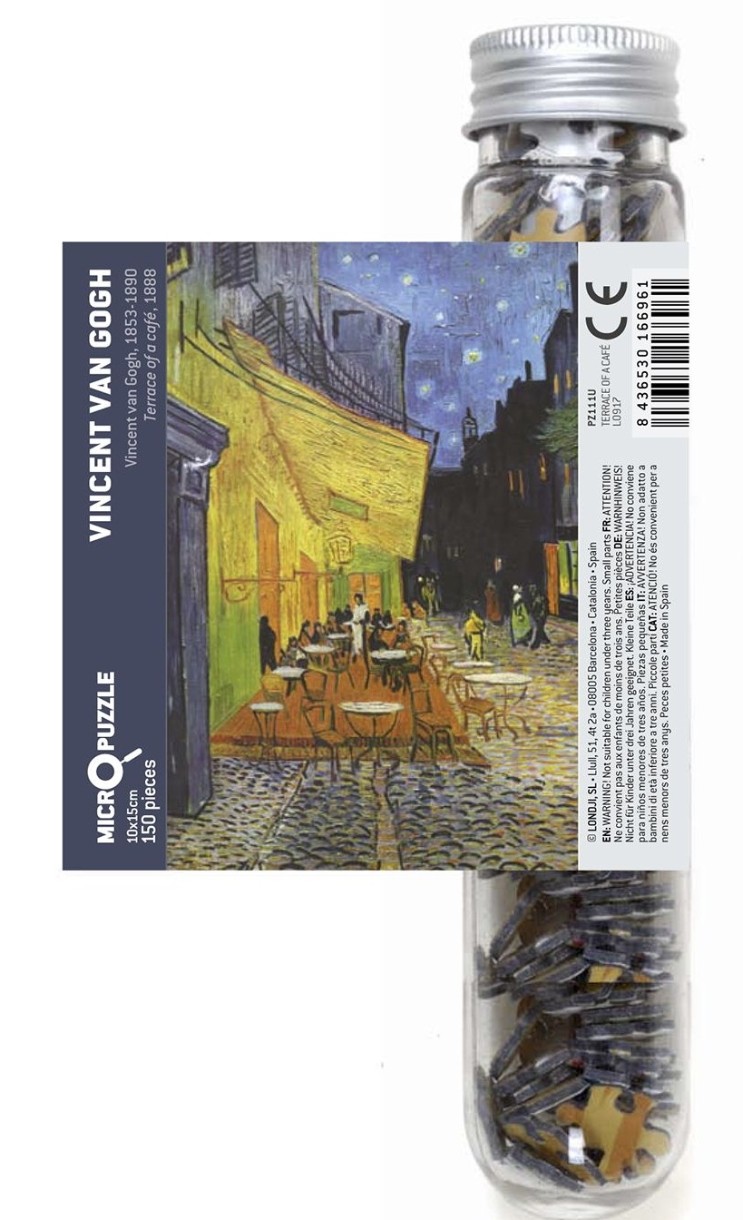 Игра-микропазл от Londji - это прекрасно иллюстрированная мини-головоломка, состоящая из 150 крохотных кусочков, которые можно хранить в удобном футляре для путешествий. После завершения головоломка оказывается картиной Винсента ван Гога «Ночная терраса кафе». Испытайте себя и других с помощью этой сложной головоломки для путешествий в колбе.
