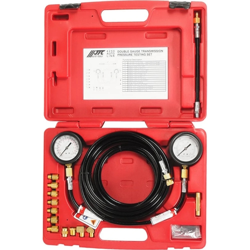 Тестер JTC-4250 разработан специально для диагностики давления масла КПП, а также тормозной системы и ABS. В комплекте представлено два манометра для высоких (500 фунт на кв. дюйм) и низких (100 фунт на кв. дюйм) значений давления. Угловые фитинги обеспечивают доступ в труднодоступные места коробки передач под углом 45 и 90°. Различные адаптеры позволяют использовать приспособления для обслуживания большинства марок автомобилей.