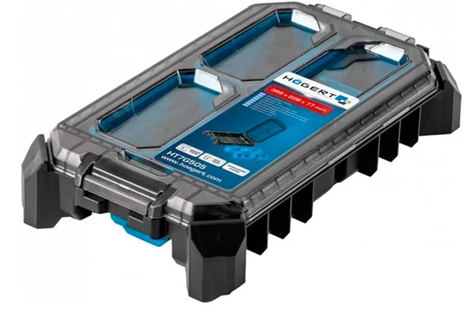 Органайзер для инструментов низкий HOEGERT TECHNIK HT7G505 228x368x77 мм - Органайзер для инструментов с крышкой из поликарбоната, используется для хранения строительного, слесарного, автомобильного и иного инструмента. Он был создан для требовательных пользователей. Он поставляется с 4 съемными ящиками, которые позволяют хранить небольшие инструменты, аксессуары и другие предметы. Прочные металлические петли обеспечивают безопасность при транспортировке. Органайзер обеспечивает легкое соединение с другими ящиками системы совместимых модульных ящиков. Предназначен для профессионального использования. Он отлично используется во многих отраслях, таких как строительство, промышленность, автомобилестроение или логистика.