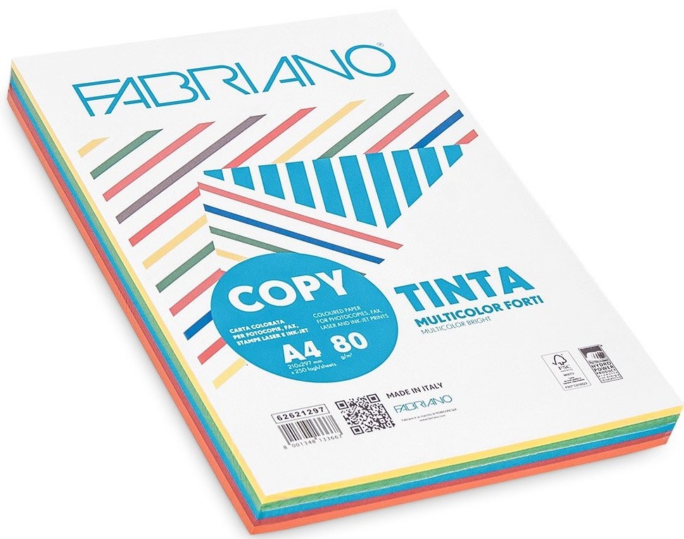 Бумага FABRIANO Tinta не мелованная, чисто целлюлозная (100%), цветная снаружи и внутри. Упаковка содержит 5 интенсивных цветов. Не содержит элементарного хлора, и кислот. Повышенная щелочная среда бумаги Фабриано обеспечивает длительную сохранность документов. Применяется для ксерокопирования, лазерной и струйной печати, факса. Цвета: желтый, зеленый, синий, красный и оранжевый.