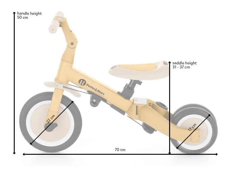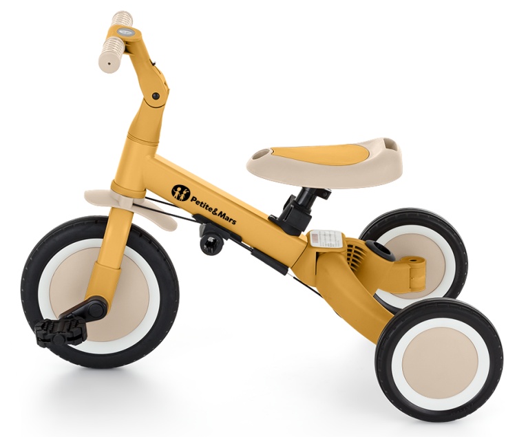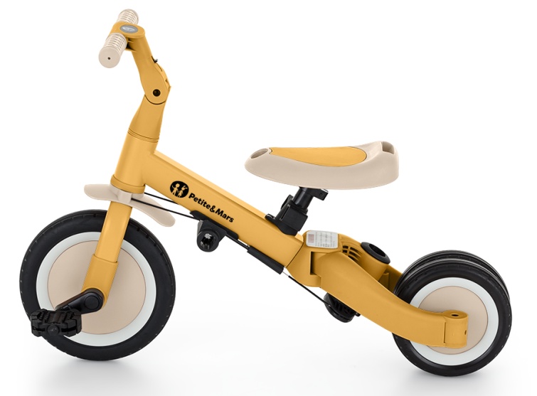 Многофункциональный трёхколёсный велосипед, предназначенный для детей от 1,5 до 5 лет и весом до 25 килограммов. Это не только средство передвижения и обучения равновесию, но и спутник подрастающего ребёнка на разных этапах развития. Продуманная трансформация велосипеда адаптируется к потребностям малыша по мере развития его моторики. Изначально это трёхколёсный велосипед с возможностью помощи родителя, а финальная версия — стандартный велосипед с педалями, без дополнительных опорных элементов. Благодаря таким изменениям в изделии вы можете помочь своему ребёнку научиться ездить на двух колёсах.