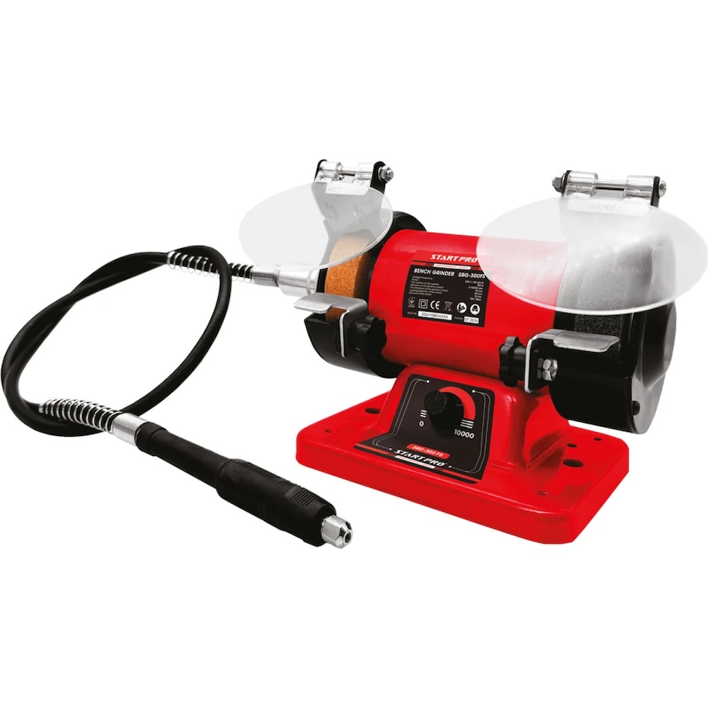 Точильный станок Start Pro SBG-300FS — это универсальный и компактный инструмент мощностью 150 Вт, предназначенный для качественной заточки, шлифовки и гравировки различных деталей. Главной особенностью модели является наличие гибкого вала длиной 1 метр, который позволяет выполнять сверхточные работы с мелкими элементами, превращая станок в полноценный гравер. Устройство оснащено асинхронным двигателем с частотой вращения до 10 000 об/мин и регулировкой оборотов, а защитные кожухи и экраны обеспечивают максимальную безопасность пользователя во время эксплуатации.