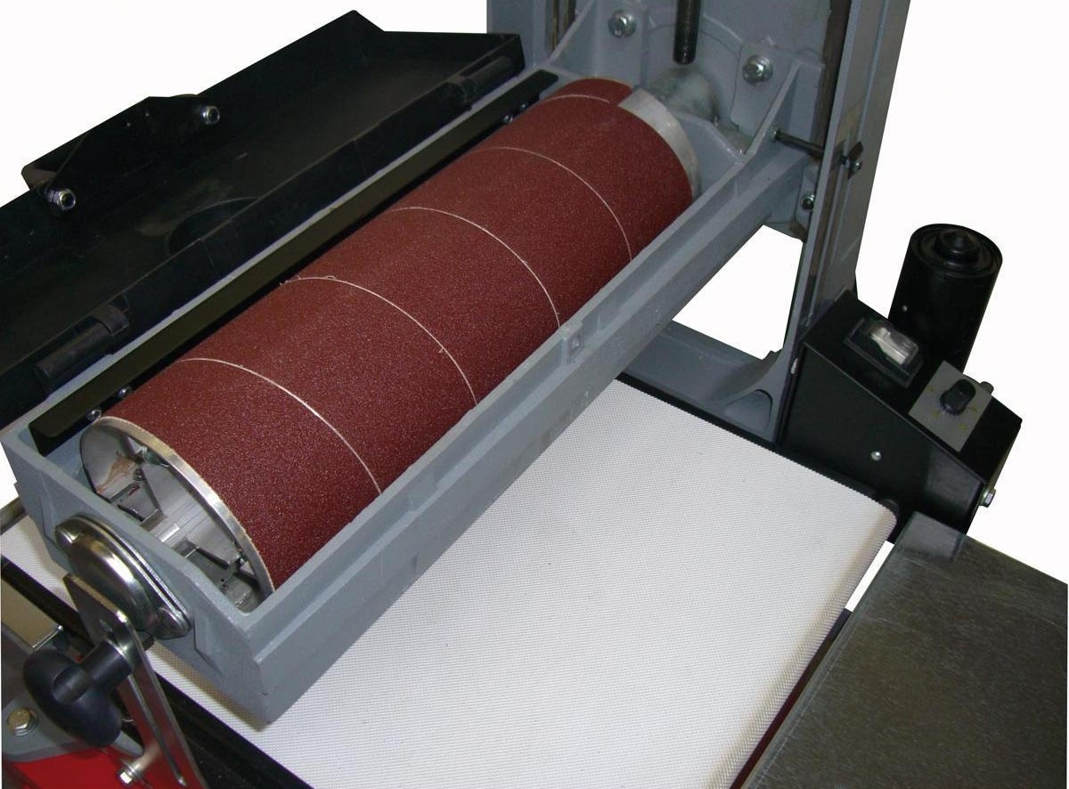 Съемный кронштейн предусмотрен для работы с заготовками шириной до 800 мм. Бесступенчатая подача регулируется специальным потенциометром. Литая чугунная конструкция шлифовального узла поглощает рабочие вибрации и придает станку устойчивое положение.