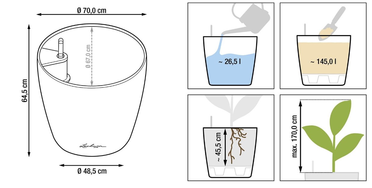 Основное преимущество – это стильный внешний вид и интеллектуальная система автополива, которая будет снабжать ваше растение водой и удобрениями на срок до 12 недель.Кашпо LECHUZA выбирают те, кто хочет украсить интерьер, занимается цветоводством, а также это выбор дизайнеров и флористов интерьера по всему миру.Покупая LECHUZA вы получаете кашпо премиум-класса европейского бренда, больше свободы – можно уехать, а растение будет обеспечено влагой и удобрениями, экологически чистый пластик, полный комплект и более активный рост растений*.* сравнение роста растений “Musa”, LECHUZA 2013