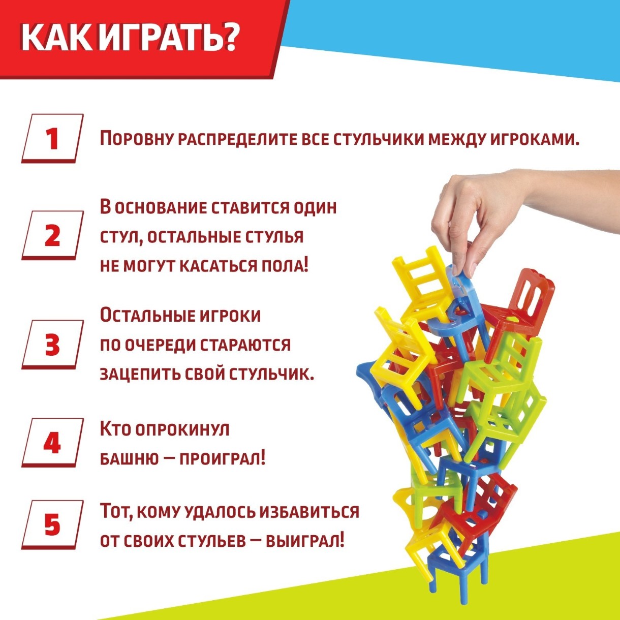 Задача каждого игрока — избавиться от своих стульчиков, расположив каждый из них так, чтобы башня не упала.