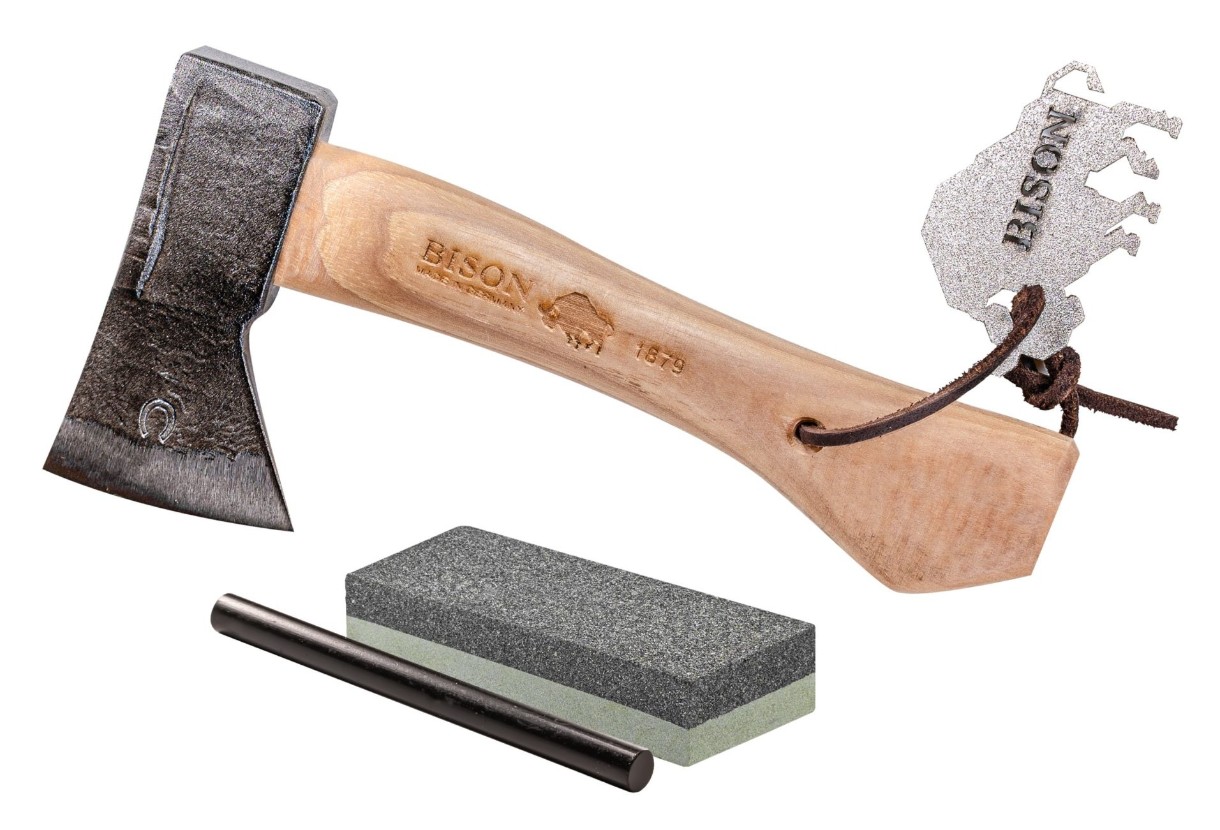Bison 1879 Trek Beil Set – походный топор в комплекте с полезным снаряжением для путешествий: огниво, точильный камень и прочная кожаная сумка для ремня и ручкой для компактной и легкой транспортировки. Идеальный компаньон в походе, благодаря небольшому весу 550 г и короткой рукоятке топор можно удобно носить на ремне или в рюкзаке. В то же время он отвечает всем требованиям, которые могут быть реализованы и с более крупными моделями.