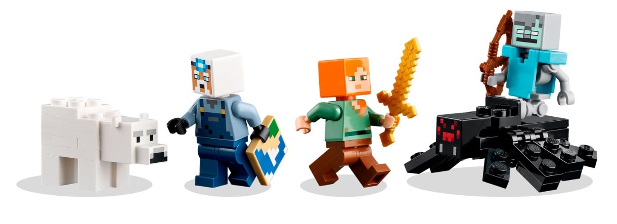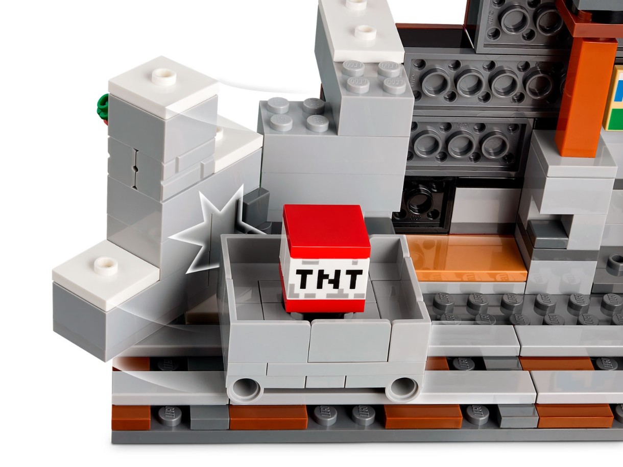 • Игровой набор представляет собой детально проработанную шахтерскую кирку с функциональными элементами – системой добычи руды, вагонеткой с рельсовой дорогой, механизмом взрыва с помощью динамита и сундуком для хранения добытых ресурсов. В качестве персонажа представлены минифигурка Алекс, шахтёр, жокей-паук, фигурка белого медведя.