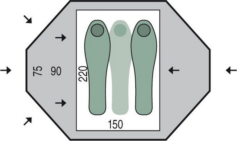 Особенности: хорошая ветроустойчивость, антимоскитная сетка на входе внутренней палатки, петли для крепления дополнительных ветровых оттяжек на боковых стенках и карманах каркаса, 2 кармана для мелких вещей внутри палатки, подвесная полка, 2 больших вентиляционных клапана на внешнем тенте, возможность входа в палатку под разным углом и с двух сторон, натяжные стропы, дополнительные дуги для поддержки тента в тамбуре.