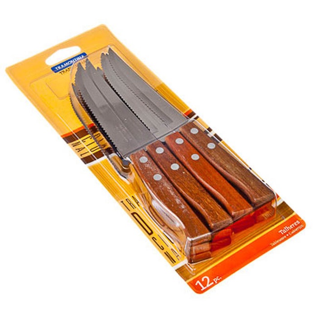 Набор из 12 ножей для стейка Tramontina Tradicional с удобной деревянной ручкой. Ножи выполнены из высококачественной нержавеющей стали AISI 420. Качество стали гарантирует, что продукция Tramontina не подвержена коррозии и (при соблюдении условий эксплуатации) сохранит блестящий вид надолго.