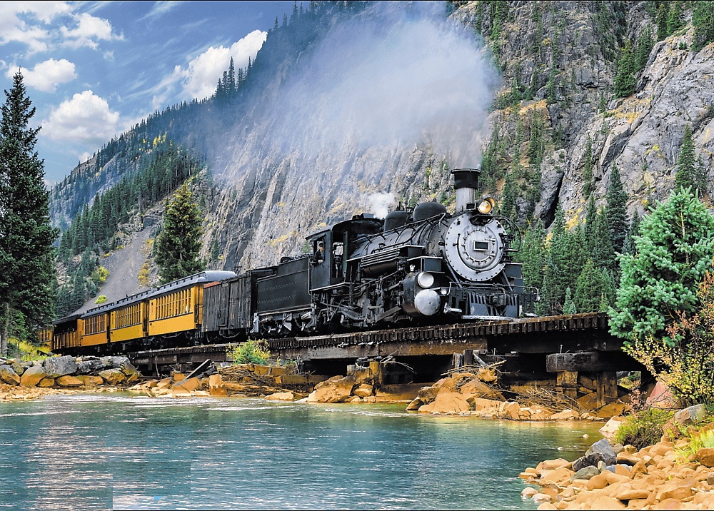 Пазлы на 500 элементов с романтическим изображением старинного поезда в красивой горной местности. В сложенном виде размер картинки составляет 48х34 см. Высокое качество, насыщенность цветов и безопасность при сборке пазлов обеспечивает специальный каландрированный картон, который отражает свет и покрыт экологическими красками.